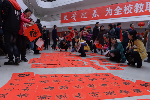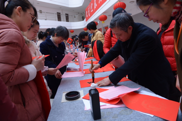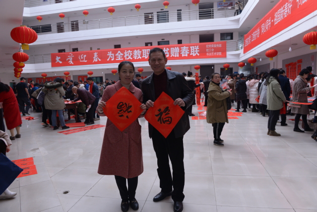 活动现场,一对对红彤彤的充满喜庆、吉祥、祝福、欢乐的春联带去了学校对广大教职工最美的祝福及对学校未来的美好期盼;一张张“福”字、“春”字,喜庆的红纸为底,黑墨为字,表达着挥别猪年、喜迎鼠年、辞旧迎新、春色满园的美好愿景。