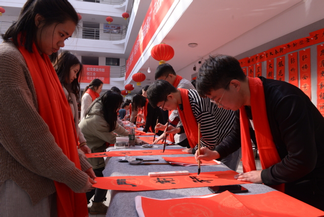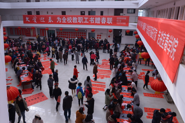 书法艺术学院的师生们凝神静气,悬笔转腕,龙飞凤舞。“民富国强万物盛,人和家兴百业昌”、“同沐春风花满地,共迎新岁喜盈门”、“才见肥猪财拱户,又迎金鼠福临门”、等春联一一送至教职工手中。欢乐吉祥的中国红把教职工对幸福生活的期望和对学校发展日趋向好的喜悦心情映照在脸上,满屋都充满了快乐祥和的年味。