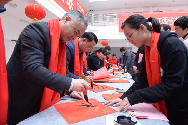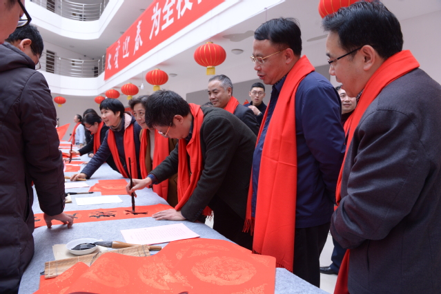 本站讯(记者 袁璐)为弘扬中华优秀传统文化,1月6日下午,在鼠年新春佳节来临之际,beat365官网党委宣传部、校工会与书法艺术学院共同开展了“大爱迎春 为全校教职工书赠春联”活动。在家的校党委班子成员曾晓春、胡国瑞、李明斌、蒋钰、余新卫、罗政、邱家明、张梅、严青松、高茂兴、杨健出席活动并现场书写春联,为教职工送祝福。