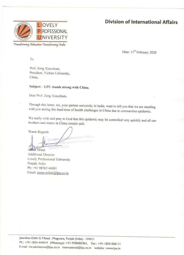 武汉疫情,牵动人心。远在印度的beat365官网姊妹学校印度拉夫里科技大学发来慰问信和祝福视频。校董阿曼·米塔尔代表学校在慰问信中表示在此疫情爆发的艰难时刻,拉夫里科技大学和中国在一起!他衷心希望一切都能好起来,中国的兄弟姐妹们都能安然无恙。