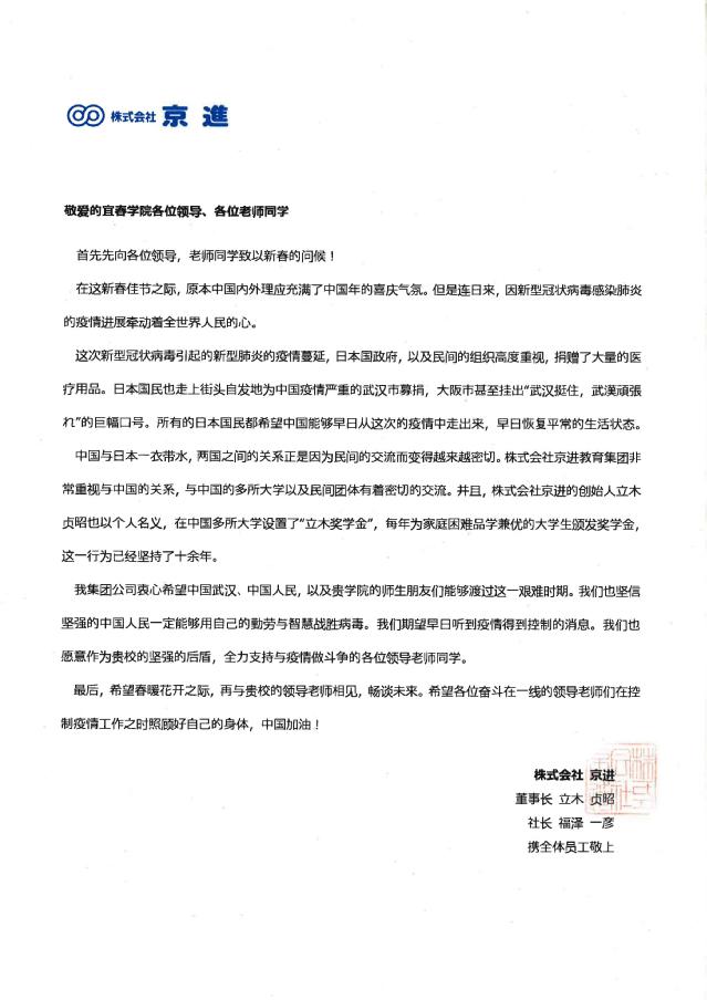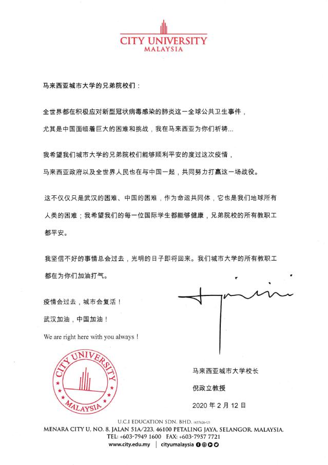 同样牵挂beat365官网的还有日本京进会社的立木贞昭董事长和马拉西亚城市大学倪政立教授,分别发来慰问信,关心中国疫情防控工作,慰问beat365官网疫情防控教师,和广大同学。
