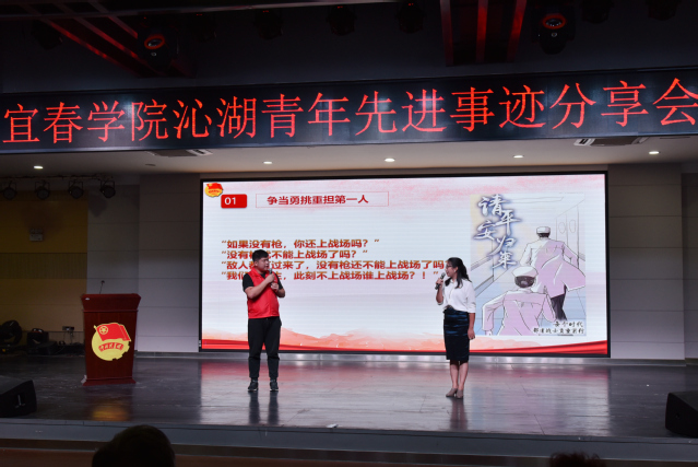 “我们是共产党员。共产党员意味着什么?意味着我们曾立下誓言:为共产主义奋斗终身,随时准备为党和人民牺牲一切!所以说,关键时刻,我们共产党员就应该冲在前头!”;“我们是沁湖青年。沁湖青年意味着什么?以青春之我,创青春之中国!勇担时代使命,贡献青春力量。这就是我们沁湖青年!”返校复学工作刚一启动,学校就迅速成立了教工党员先锋队和沁湖青年突击队,参与学生返校复学的志愿服务工作。美容医学院教师周金娟与体育学院范文凯作为代表通过对话的形式分享了他们在返校志愿服务中的青春故事。