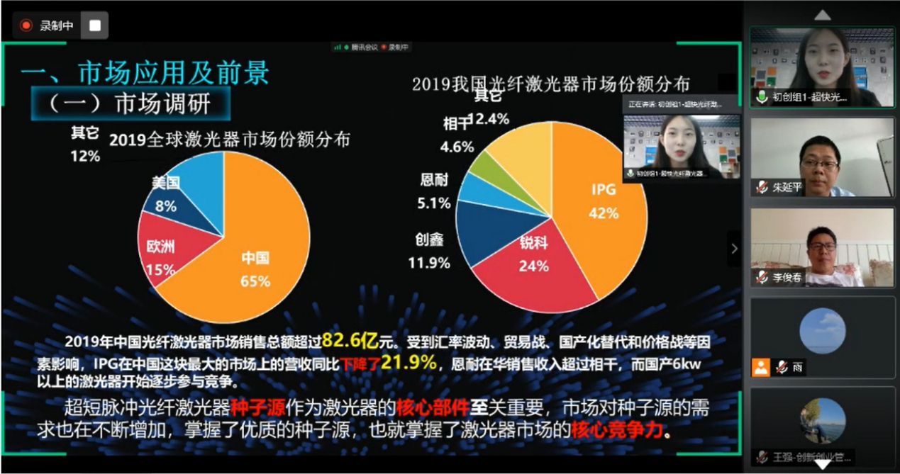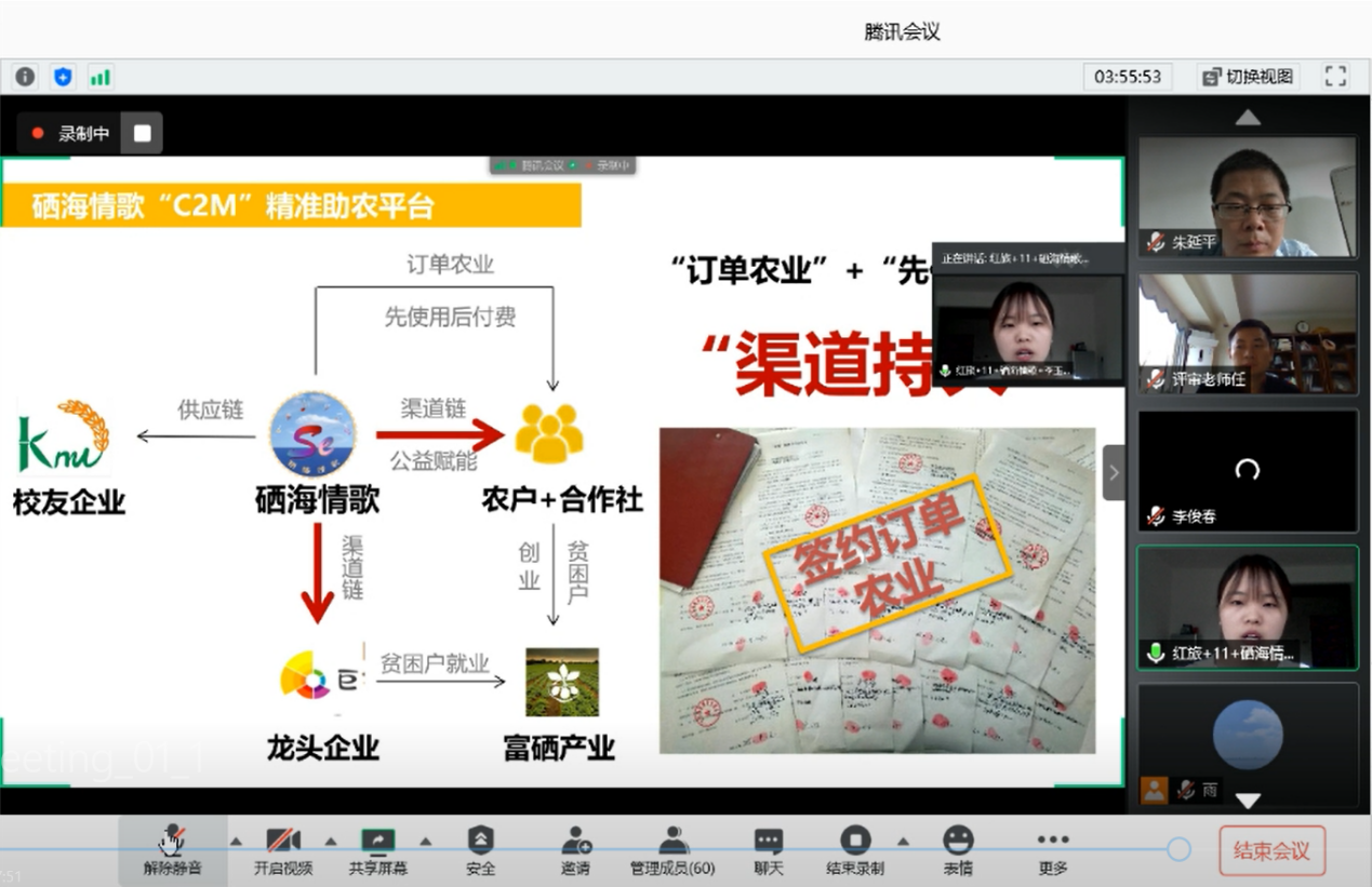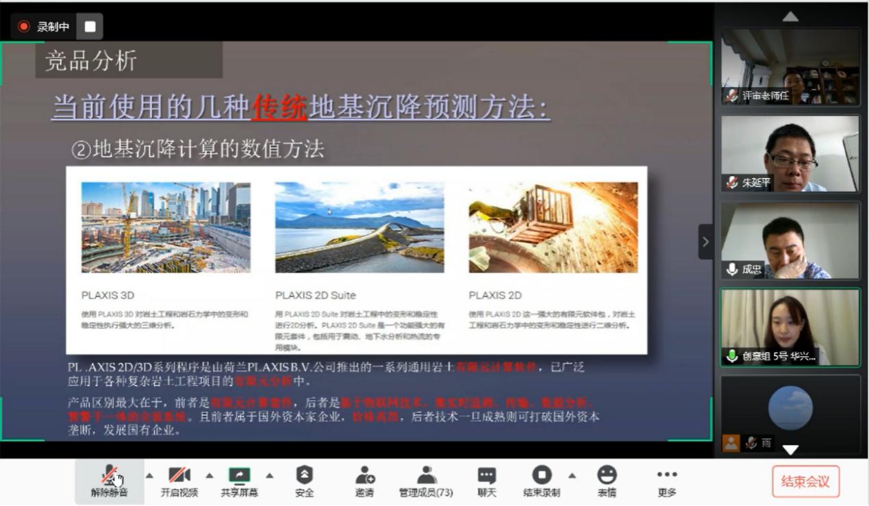本次大赛采用线上路演8分钟,专家评委线上提问5分钟的模式进行。各项目团队通过PPT展示和演讲,就产品介绍、市场定位、商业模式、营销策略、财务分析、风险控制、团队结构等内容进行了重点阐述。