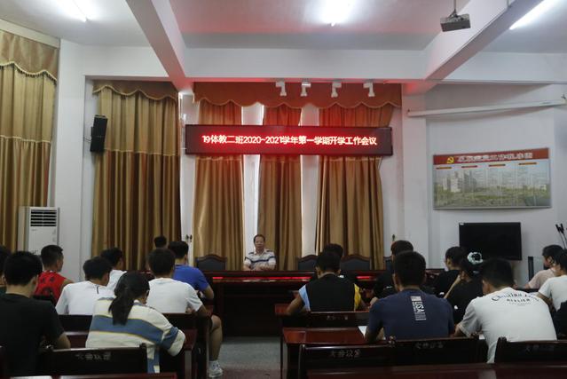 本站讯(学生记者 刘妃琴)9月4日下午,19级体育教育二班召开2020-2021学年第一学期开学后的第一次校园疫情防控、校园安全、厉行节约等相关主题班会。体育学院党委书记、19级体育教育二班第二班主任、专业导师谢军教授出席会议。