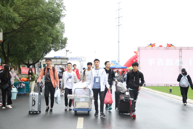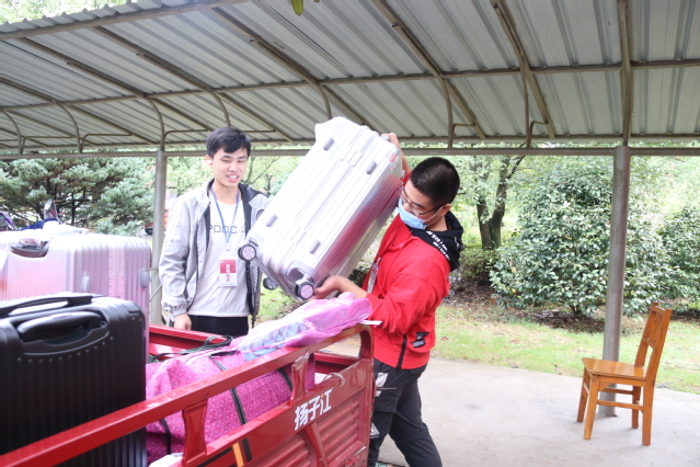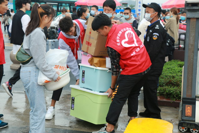 今年因为疫情防控的原因,所有家长都不能送新生进校。考虑到新生来校行李多,校门口离学生公寓还有不小的距离,学生志愿者们在这三天统统都变身成为爱心搬运工,租小推车、三轮车,上千名学生志愿者共同上演“接过你的行李”的画面,成为校园里一道亮丽的风景线。