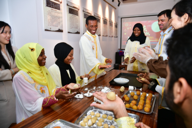 随后,同学们还体验了月饼制作,当看到自己的劳动成果呈现在面前时,留学生的脸上露出了灿烂的笑容。坦桑尼亚的Halima来中国已经第二年了,这是她第一次做月饼,显得非常兴奋,看着自己制作的月饼成型,一个劲的直呼太漂亮了。