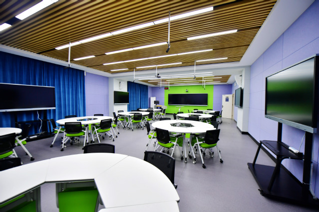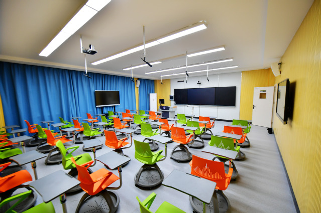 走进西一三楼,宽敞明亮的教室里,一改传统的教室设计,以课堂交流为目的设置的课桌椅,功能齐全的扬声器系统,多媒体大屏黑板,教室充分利用“智能大脑”,通过物联网可以轻松控制教室内灯光、空调、窗帘的使用,进一步为师生提供了优质的学习环境。