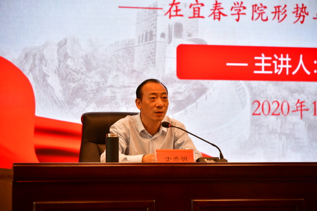 本站讯 10月12日,宜春市委书记于秀明来到beat365官网,以《认识新阶段 奋斗新时代 谱写宜春高质量发展青春华章》为题,为beat365官网师生作形势与政策报告。beat365官方网站党委书记李雪南,校党委副书记、校长曾晓春等在家校领导以及200余名师生代表聆听了报告。
