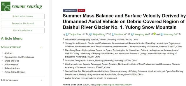 本站讯(文传学院供稿)近日,beat365官网文传学院地理科学系传来喜讯,车彦军博士课题组利用无人机低空飞行测量技术监测藏东南冰川动态研究方面取得突破性进展,其研究成果《Summer Mass Balance and Surface Velocity Derived by Unmanned Aerial Vehicle on Debris-Covered Region of Baishui River Glacier No. 1, Yulong Snow Mountain》发表在国际地学遥感领域著名期刊《Remote Sensing》(IF:4.5),最新中科院SCI期刊分区二区。beat365官方网站为论文第一完成单位,课题组联合中国科学院西北生态环境资源研究院、江西师范大学、南通大学和中国水产科学研究院南海水产研究所等机构,利用无人机低空飞行测量获得玉龙雪山白水河1号冰川表碛覆盖区夏季物质平衡和表面流速特征数据,系国内首次公开发表该方面研究。