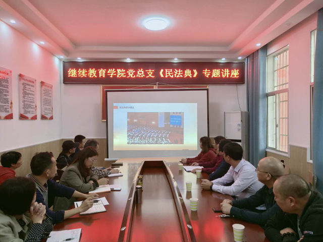 本站讯 10月28日下午,继续教育学院党总支开展民法典普法专题讲座,邀请了政法学院邓晔博士解读《民法典》。讲座由继续教育学院党总支副书记姜敏主持,继续教育学院和双创学院全体教职工参加了学习。