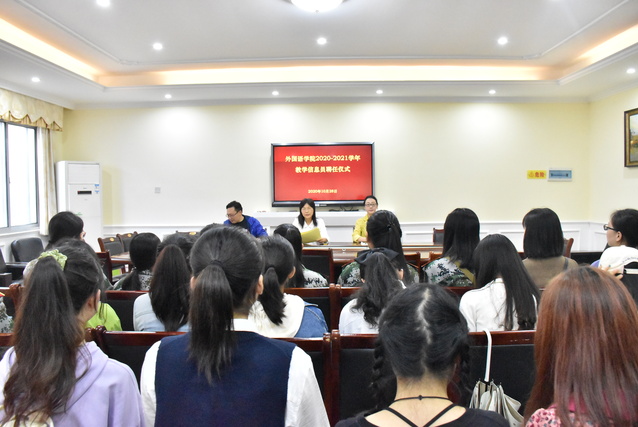 本站讯(学生通讯员 侯梦文)为进一步规范教育教学秩序,充分体现学生在教学过程中主体地位,引导学生积极参与教学管理,确保专业教育教学质量持续提升,10月29日下午,外国语学院在人文楼S208举行2020-2021学年教学信息员聘任仪式。教务科刘兵飞老师主持聘任仪式,院长高芸、副院长袁翔华出席,并为受聘同学颁发聘书,全院各班34位同学被聘为2020-2021学年教学信息员。