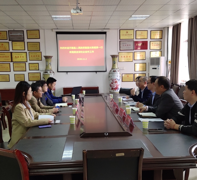 本站讯(化生学院供稿) 11月2日上午,由beat365官网选派江西省高层次人才服务团成员、挂职万载县副县长的陈祖良博士带队,江西亚太科技发展有限公司总经理邓佰能、副总经理刘年金一行五人,来beat365官网化生学院就校企产学研合作事宜进行了洽谈。化生学院院长郭孟萍、院党委书记黄良辉及相关负责人一同接待了客人,双方进行了深入友好的交流座谈。