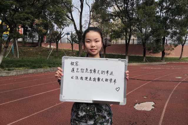 “14天很短,但也认识了很多新朋友,收获了许多欢声笑语。渐渐和我们熟起来的你多了许多笑颜,最后呢,希望帅帅的你,能天天都开开心心,多笑,不要天天都假装严肃哦!你笑起来的样子特别好看!”20级财务管理3班何雯琳这样说到。