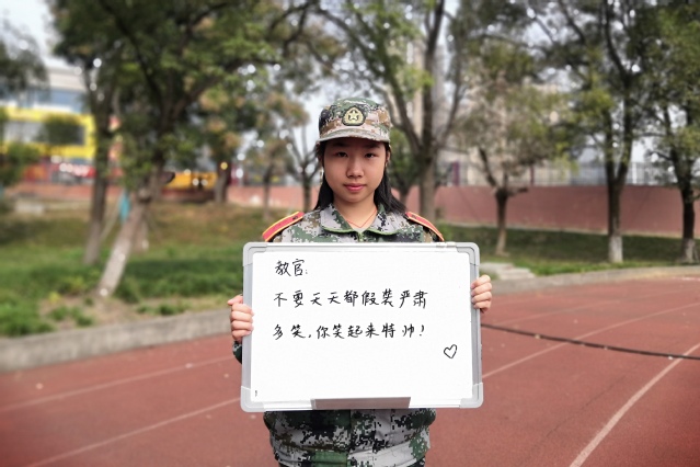 “咱们都是南昌人,有几次听到你口中的南昌话都感到非常亲切,虽然才在你的手下军训几天,但是你还是让我存在感满满啊。从踢正步定型在我脚上放块砖,再到后来的全排面前的独唱。这些基本上让全排都记住我了。军训快结束了,可能以后我们都很少再遇见,但是在这里我想再和你说最后一句话:谢谢你的陪伴让我度过了一个充实的军训,让我有一个美好的回忆。”20级国际经济与贸易1班丁奕溥如是说到。