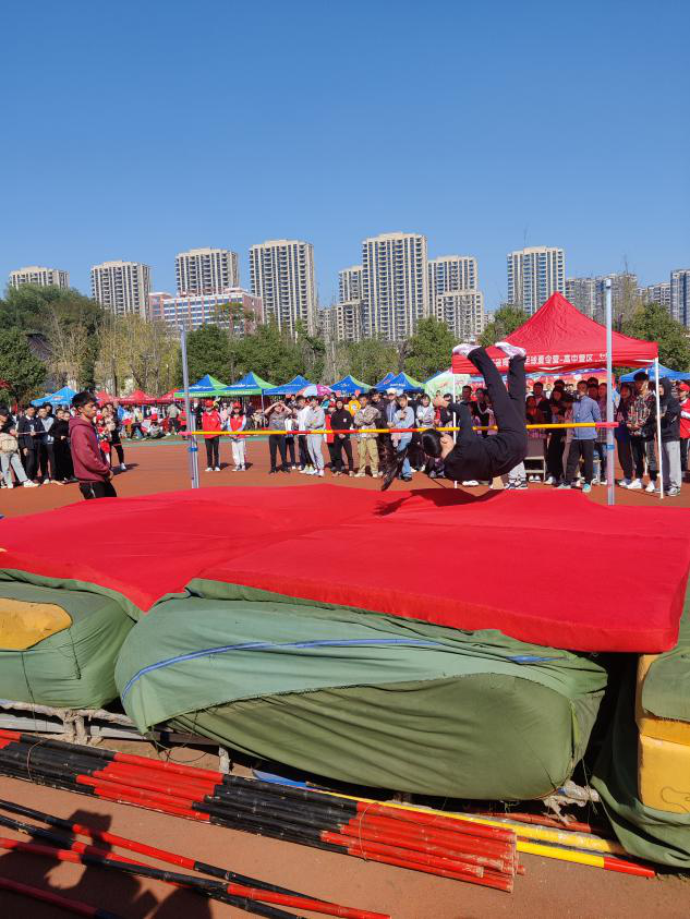 在众多赛事中,女子跳高比赛也在如火如荼的进行中。赛事已经进行到最后一轮了,在观众的瞩目中,音舞学院黎芳同学开始助跑,跑至竹竿前一秒用力腾身一跃,身体如同矫健的燕子低空飞过,在众人面前划过一道优美的弧线,最后完美的落在了大红色的垫子上,一连串的动作如同已经练过千遍万遍般流畅,1.36秒的漂亮成绩由她创造,成功取得了全场最佳成绩,拿到了冠军,赢得了观众的阵阵欢呼与掌声。黎芳脸上挂着胜利的笑颜,轻巧的从垫子上跃下。从助跑的从容到腾空跃起的勇敢再到成功的淡然,黎芳从来自信,去年冠军是她,今年的冠军也非她莫属!