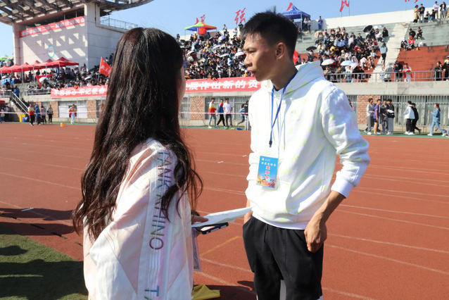 主席台上的播音员手持话简不辞辛苦的一遍又一遍地播报。声音就是他们最富有活力的武器,富有激情和磁性的声音代表着充满温暖人心的黄色,如同朝阳铺满大地般的暖色。校运会的第一天,笔者在结束的时候有幸采访到20级新生向凤兰播音员,他带着笑容地告诉笔者:“在来到beat365官方网站的第一年就能够在校运会这个舞台上尽自己的力量帮助学校、同学,我现在特别激动,也特别自豪。”