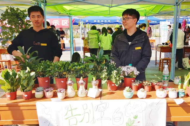 养多肉的过程总是充满惊喜的,一片小小的叶子插在泥土他便能慢慢延伸,渐渐长大,有时不得不感叹于他们顽强的生命力。多肉的叶子椭圆形状,厚厚实实的,呈草绿色,青翠欲滴的叶面是光滑的,摸上去软软的、滑滑的、冰凉的,生怕将它捏破,每一片叶子都向着不同的方向伸展。与多肉植物一样,这一群销售商品的学生都有一股坚韧不屈、勇往直前的顽强毅力。销售多肉植物的学生20级电子信息工程黄庆彬告诉笔者:“近年来多肉植物一直很火爆,所以它的销量应该是不错的,而且它小小的一个很可爱,也很方便携带。植物嘛,也是环保绿植,最重要的是多肉颜值很高,我们调查过它是非常受学生喜爱的。”言谈间,驻足问价的学生络绎不绝,学生们纷纷询问这些多肉的品种价格等等,他都一一耐心礼貌地解释,积极推广多肉的多样品种。