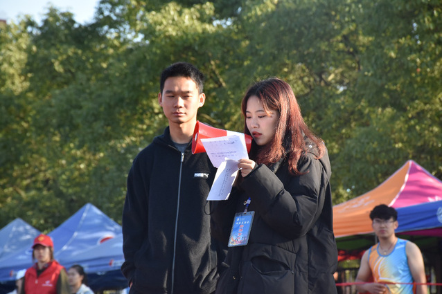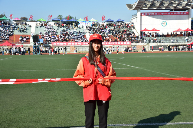 广阔的绿茵场上,人群中的点点红,那是青年志愿者的风姿。搀扶负伤的运动员、悉心询问运动员所需、鼓励失败彷徨的选手......他们始终以最饱满的热情服务大众。他们四处奔波,却未收获掌声。他们不是温室的花朵,不论秋风多么冷冽刺骨,他们始终坚守在自己的岗位上,认真维持赛道秩序,为每一场赛事提供扎实的场外保障。“以前参加过敬老院的志愿活动,所以,这是我第二次当志愿者啦!虽然天气有些冷,不过我看着跑道上奋力奔跑和坚持的运动员,内心就翻腾着热血,我觉得他们很棒,我很享受这个过程!” 19数应班易晴同学如是说道。这个可爱的女孩洋溢着笑脸,正在赛道旁维持着秩序。几许真诚的鼓励,几句亲切的问候,几多支持与帮助,无私助人即是他们的标签,他们是最可爱的人儿。