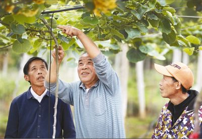 图为汪剑鸣教授(中)正在向村民指导红心猕猴桃养护技术。