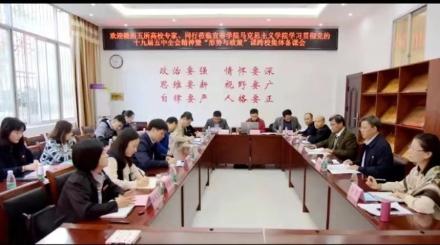 本站讯(马克思主义学院 供稿)11月19日,赣西六所高校马克思主义学院(思政教学部)学习贯彻党的十九届五中全会精神暨“形势与政策”课跨校集体备课会在beat365官网举行。校党委书记李雪南莅会指导。他强调,学习好、贯彻好、宣讲好党的十九届五中全会精神是当前全党全国最大的政治任务,上好“形势与政策”课是高校学习好、贯彻好、落实好党的十九届五中全会精神的最好形式。本次集体备课非常及时、非常必要、非常有意义,通过集体备课集中智慧、集思广益,交换思想、分享经验、取长补短,在交流中深化认识、增长见识、达成共识。希望通过本次备课活动进一步提高赣西高校思政课教学水平,加强赣西高校在思政理论课教育教学方面的交流合作;希望思政课教师不满足于做“知识的搬运工”,而要努力成长为思想、理论和观点的创立者、教授者、传播者,充分发挥党的创新理论对大学生成长的政治引领、价值塑造作用。