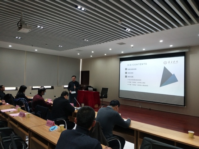 开题评审会由数计(服务外包)学院院长胡红武主持。新工科项目负责人、数计(服务外包)学院党委书记甘诚智教授从项目背景、项目拟解决的根本问题、改革思路和具体举措、该院新工科探索前期进展、研究计划与预期成果等方面介绍了项目情况。