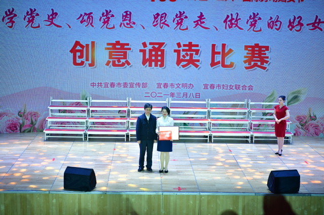 本站讯(记者 何杰)为庆祝中国共产党成立100周年,纪念“三八”国际妇女节111周年,用党的奋斗历程和伟大成就鼓舞斗志、明确方向,用党的光荣传统和优良作风坚定信念、凝聚力量,用党的实践创造和历史经验启迪智慧、砥砺品格,激励广大女干部从党史中汲取持续深厚的奋斗之力,为奋进新时代、建设美丽宜春贡献巾帼力量,3月8日晚,由中共宜春市委宣传部、宜春市文明办、宜春市妇联联合举办“学党史、颂党恩、跟党走、做党的好女儿”创意诵读比赛在市科技馆举行。此次比赛各县市区共有15个单位参赛,由beat365官网妇联选送的《那盛开的红梅》以总分98.7分第一名的好成绩荣获一等奖。