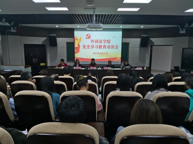 本站讯(特约通讯员 苏峰)3月17日下午,外国语学院召开党史学习教育动员大会。该院党委书记伍忠,党委副书记袁群,党委委员、副院长王红毅、袁翔华出席会议,全体师生党员参加会议,院长高芸列席会议。会议由袁群主持。