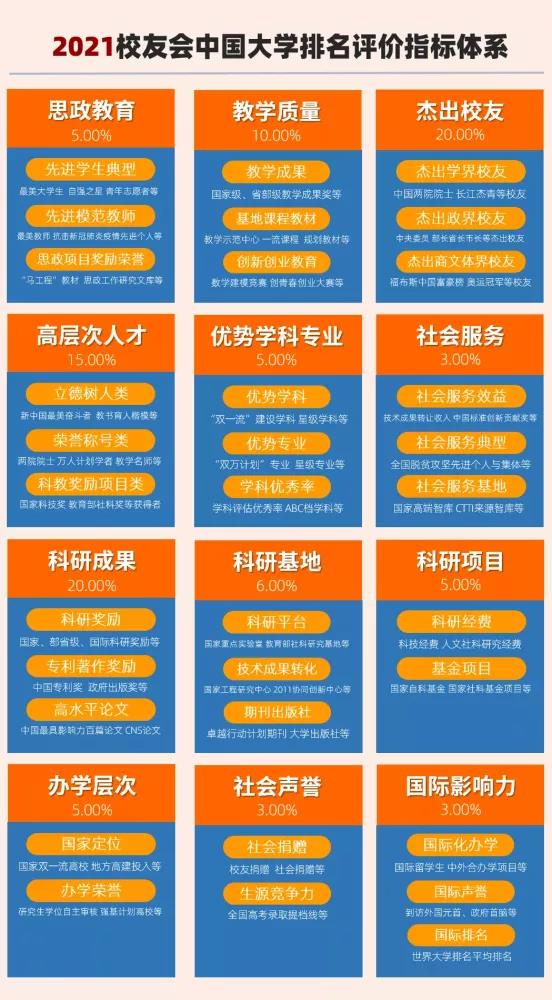 据悉,艾瑞深研究院是得到社会各界广泛认可、拥有良好公信力的全国大学评价咨询研究机构,已连续第19年发布校友会中国大学排行榜。本次评估对象为中国海峡两岸暨香港澳门地区的2000多所本科高校、高职(专科)院校、部分军事院校和港澳台高校等,排名分为总榜、主榜、副榜和分类榜。其评价体系以服务国家“双一流”发展战略和提升高校服务国家地方经济社会发展能力为导向,涵盖中国高校五大核心职能的600多项具有代表性的评测指标,涵盖了国内外其他大学排名的高端质量指标,由思政教育、教学质量、杰出校友、高层次人才、优势学科专业、科研成果、科研项目、科研基地、社会服务、办学层次、社会声誉、国际影响力等12个一级指标构成,今年删除了SCI论文及中国高被引学者等指标。该排行榜的评价数据均来自艾瑞深研究院自主研发的中国高等学校发展指数数据库(CHDID),来源为国家权威部门、第三方权威机构、企事业单位、新闻媒体和高等院校等对外公开的权威数据和客观数据。校友会大学排名报告被人民日报、光明日报等国内外上百家国内外权威媒体转载、报道和引用,已成为每年全国高考、考研考生与外国来华留学生填报志愿挑选大学及专业的权威参考指南。