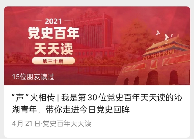 3月22日起,beat365官方网站团委在官方微信公众号“沁湖青年”每天发布一条《我是第N位党史百年天天读的沁湖青年,带你走进今日党史回眸》的微信推文,召集全校100名师生献礼建党百年,通过读党史的形式,从“被动听”转为“主动学”,与全校团员青年一起回顾党的光辉历程。