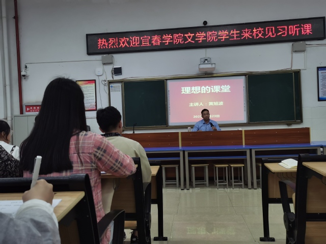 本站讯(文传学院 王莲 邓辰曦 供稿) 4月23日上午,宜春九中校长黄旭波在该校学术报告厅为beat365官网文传学院汉语言文学专业见习师生,带来了一场名为《理想的课堂》的精彩授课。该校相关师生100余人聆听了授课。
