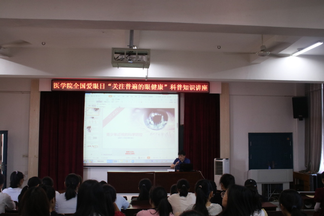 本站讯(学生记者 朱经发)2021年6月6日,是第26个全国“爱眼日”,今年的主题是“关注普遍的眼健康”。今年是中国共产党成立100周年,为了更好地提高beat365官网师生的眼健康,普及健康用眼知识,积极践行“我为群众办实事”要求,医学院在6月6日上午9点于逸夫楼N401邀请宜春市人民医院眼科专家开展“关注普遍的眼健康”科普知识讲座以及眼科义诊活动,参与此次活动的还有眼科陈建主任、彭红主任、任敏荣等医护人员、医学院党委副书记刘斌,教师和学生代表240余人。