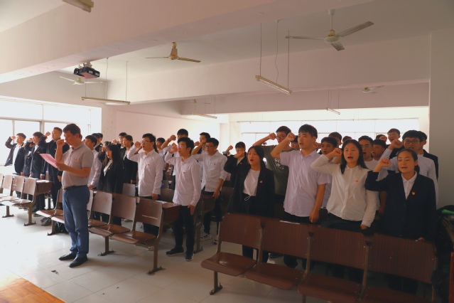 面对鲜红的中国共产党党旗,学生党员代表举起右拳,带领新党员一起庄严宣誓:“我志愿加入中国共产党,拥护党的纲领,遵守党的章程,履行党员义务,执行党的决定,严守党的纪律,保守党的秘密,对党忠诚,积极工作,为共产主义奋斗终身,随时准备为党和人民牺牲一切,永不叛党。”铿锵有力的宣誓,表达了大家对党的无限忠诚、热爱和听党话、跟党走的坚定决心。