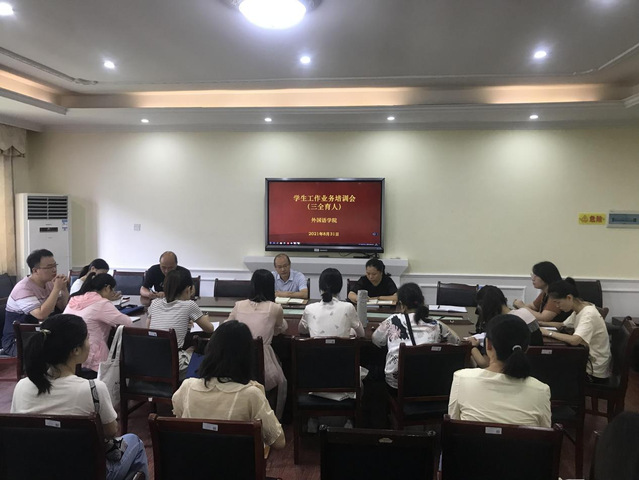 本站讯 (特约通讯员 黄大杰)为着力推进三全育人,落实立德树人根本任务,确保学生工作扎实有序进行,营造新学期良好氛围,8月31日上午,外国语学院召开了学生工作业务培训(三全育人)专题会议。该院党委书记伍忠、副书记袁群出席会议,专职组织员苏峰、学生工作办公室副主任聂涵以及全体辅导员(班主任)参加。
