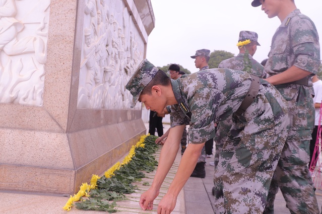 最后,全体成员依次走到烈士纪念碑前,献上手中的鲜花,并瞻仰了纪念碑和英名墙。
