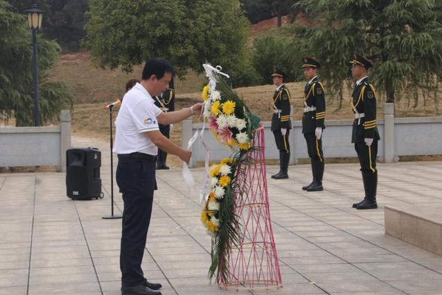 葱茏抱翠、庄严肃穆,上午10时,师生代表在宜春烈士陵园纪念碑前,向为中国人民解放事业和共和国建设事业英勇献身的烈士默哀,国旗护卫队为革命烈士敬献花篮,教务处副处长肖平平上前整理花篮缎带。