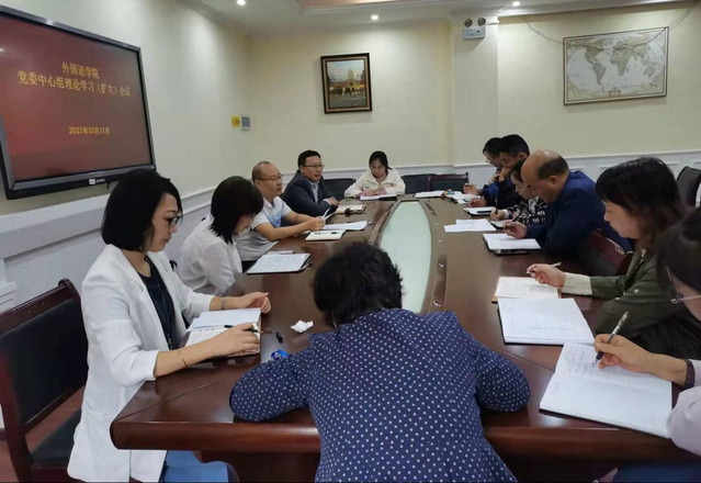 本站讯(外国语学院 供稿)10月11日上午,外国语学院党委中心组在院会议室召开理论学习(扩大)会议,全院行政人员参加会议,院党委书记伍忠主持会议。