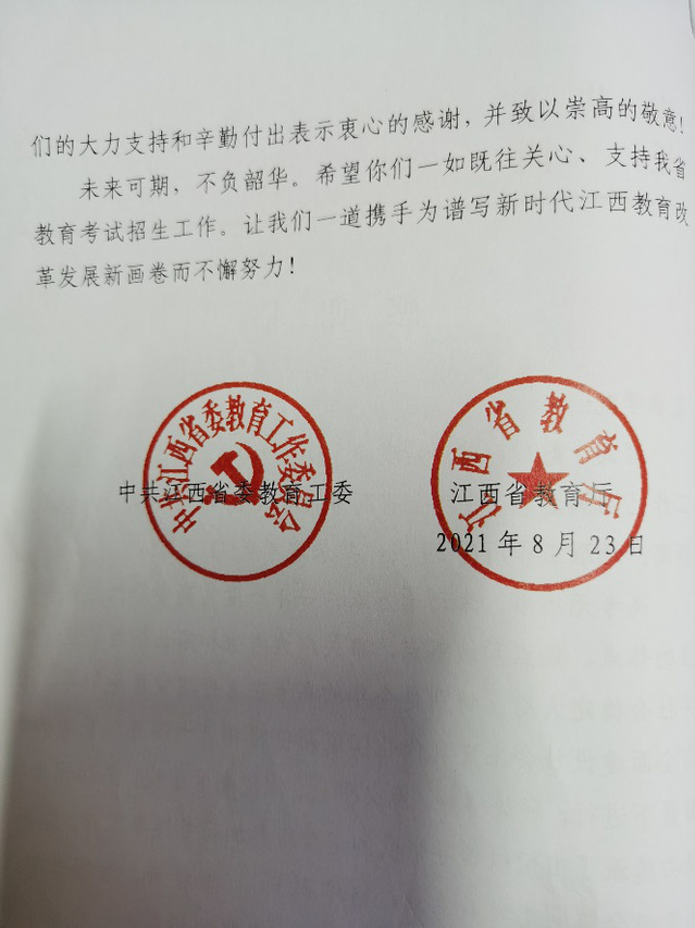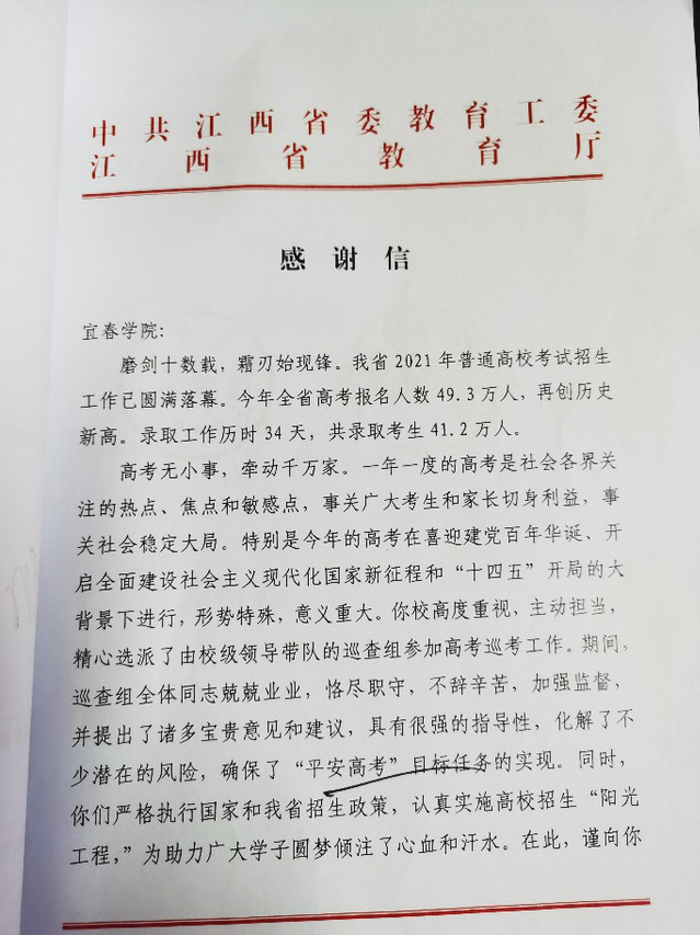 本站讯(招生就业处 供稿)近日,beat365官网收到中共江西省委教育工委、省教育厅的感谢信,对beat365官网派出的高考巡查组参加2021年高考巡考工作给予了充分肯定。
