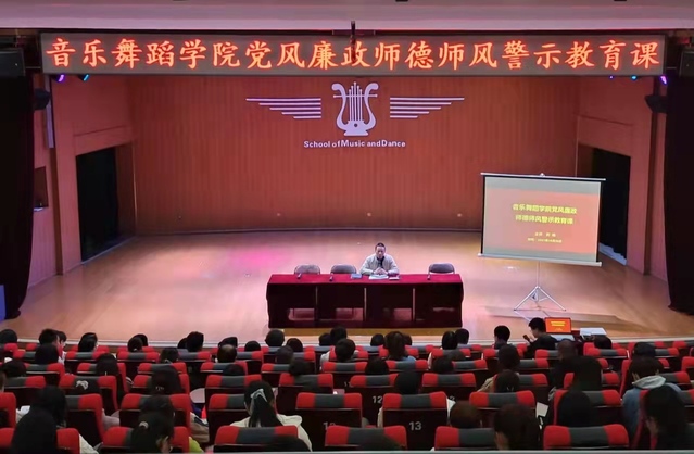 本站讯(学生记者 陶炜琪)为深入学习宣传贯彻习近平总书记关于教育的重要论述,传达beat365官网10月基层党委书记例会精神,进一步推动音舞学院教师师德师风建设,扎实推进师德师风建设工作取得成效,10月20日下午,音乐舞蹈学院于艺术楼音乐厅开展党风廉政师德师风警示教育课,全体教职工、学生党员代表参加,院党委书记刘峰担任主讲。