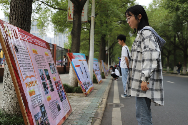 校运会正在如火如荼地进行,绿茵场上挥舞着的彩旗迎风飘扬,加油呐喊声热情高亢。运动健儿们在场上赛出风格、赛出水平,洋溢着充满活力的体育运动精神。将镜头转向赛场外,桂花沁人、书香浓郁,学习始终是校园中不变的主题,永恒的旋律。开展党史教育,传承红色基因,通过校园文化展的形式,能让更多同学积极融入其中,切身感受党史文化,体会红色精神。在数计学院的展板中,有一则介绍吴应谱夫妇故事的板块,20机制3班的李海莲同学站在其面前说到:“每当我脑海中想起扶贫路上牺牲的一个个英雄故事时,情感都久久不能平息”。在田径场内有着激情酣畅,在田径场外仍有感动和温情。