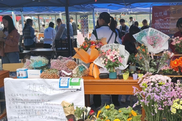 排球场的一角里,一家最美店铺吸引着来往的学生于此驻足,正如店名“植遇”一样,满天星、相思豆、香槟玫瑰等各种花卉和同学们相约而绽放于此,给同学们寄以美好。