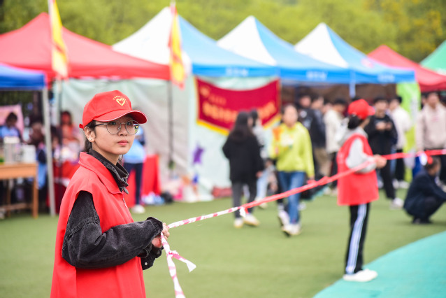 热闹的赛场上,运动健儿们在跑道上活跃着,这井然有序的背后,是青年志愿者的默默守护。志愿者总是独自一人,手中拉着红色警戒线,每当有人想横跨跑道时都会轻声劝告, 他们用青春诠释奉献,他们用奉献彰显热情。运动场上的红色身影像一汩汩清泉,滋润着运动员的心,无声地把贴心服务洒满赛场。