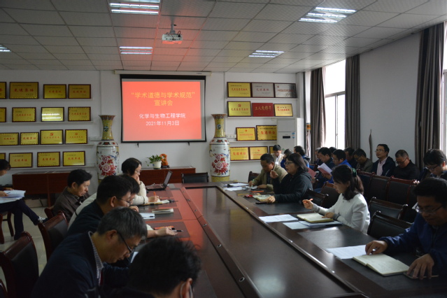 本站讯(学生通讯员 崔立雪 汤家源)为规范教师学术行为,提升学术道德修养,促进形成良好的学术科研风尚,11月3日下午,化学与生物工程学院召开了学术道德与学术规范学习宣讲会,该院党委书记黄良辉、院长郭孟萍、副院长张文彬、院党委副书记陶华蕾出席会议。