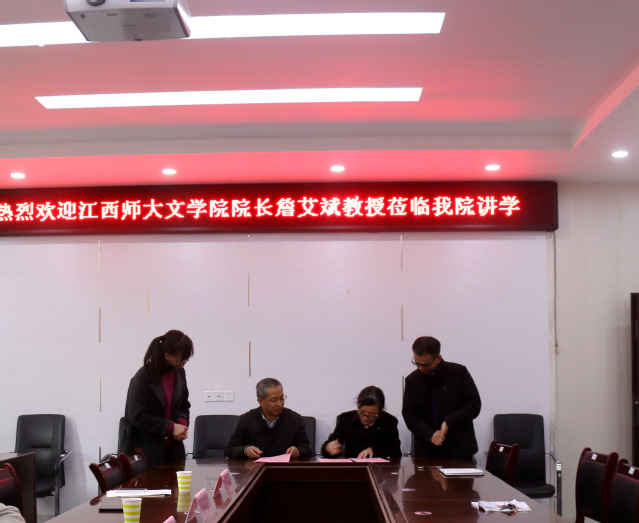 本站讯(学生记者 廖慧 汪梦琪 张铭)为落实合作事项,12月15日,江西师范大学文学院院长詹艾斌一行3人来到文学与新闻传播学院签订合作协议。院党委书记刘建平,院长冷瑾,党委副书记黄国斌,及相关专业教师参加了会议。
