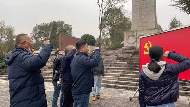 革命烈士纪念碑前,全体党员面对鲜红的党旗,举起右拳,用铿锵有力的声音重温入党誓词。
