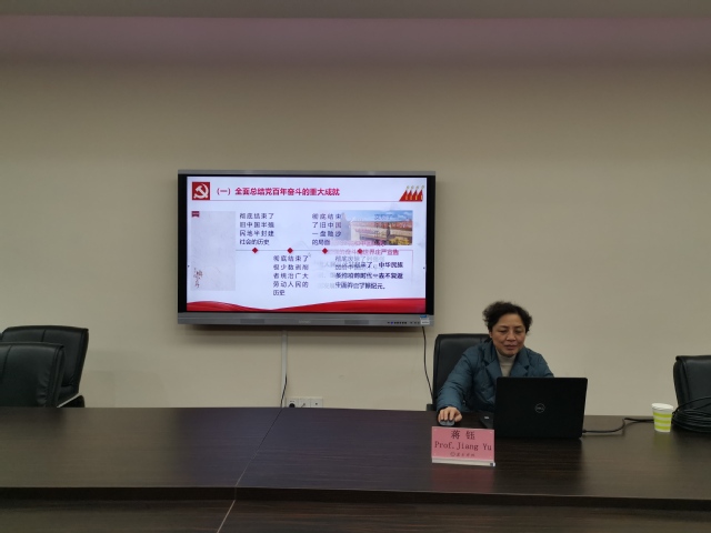 蒋钰从党的十九届六中全会召开的背景、《中共中央关于党的百年奋斗重大成就和历史经验的决议》的主要内容、学习六中全会精神这些表述要精读、党的十九届六中全会的重大意义等四个方面做了宣讲。报告图文并茂、深入浅出、言简意赅,具有很强的指导意义。