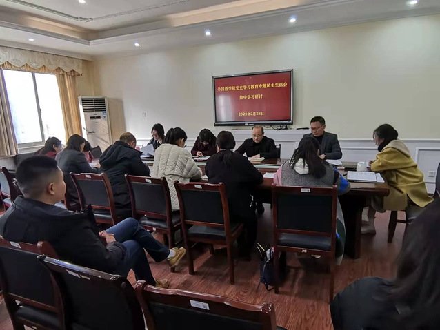本站讯(外国语学院 供稿)2月28日上午,外国语学院党委于该院会议室召开中心组专题学习会议,就党史学习教育专题民主生活会进行会前集中学习研讨,会议由该院党委书记伍忠主持,院领导、各科室人员参加了学习会。