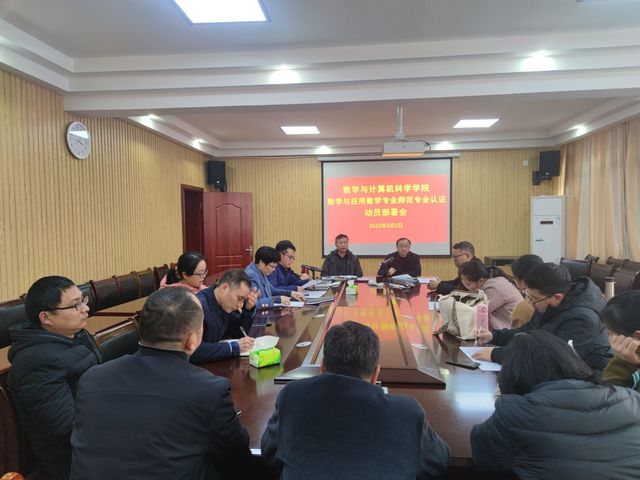 本站讯(数计学院 供稿)为做好数学与应用数学专业师范认证工作,3月2日下午,数学与计算机科学(软件服务外包)学院在该院会议室召开师范专业认证动员部署会。该院党委书记甘诚智,院长胡红武,副院长何渊仁、臧爱彬及各科室负责人、全体数学老师参加了会议。会议由臧爱彬主持。