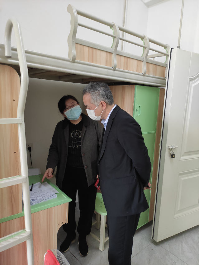 曾晓春一行先后来到学校隔离寝室、校本部快递服务点等地,实地检查疫情防控各项工作,检查中,曾晓春仔细查看值班日志,详细了解快递消杀情况。