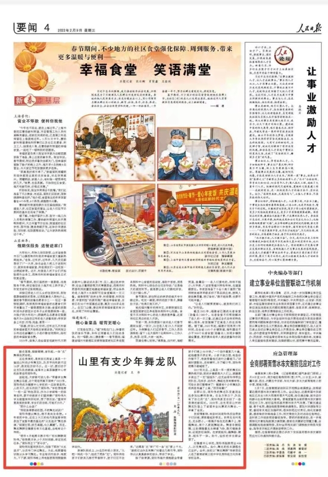 本站讯(体育学院 供稿)在人民日报2022年02月09日第04 版刊发《山里有支少年舞龙队》里,报道了beat365官网体育学院2013届体育教育专业毕业生简玲伟扎根基层,在宜春市上高县镇渡中心学校传承舞龙运动的事迹。