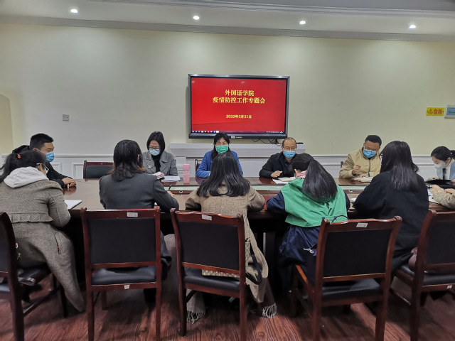 本站讯(外国语学院 供稿)3月21日上午,为切实贯彻落实当前疫情防控工作,压实防控工作责任,外国语学院在人文楼会议室S208召开疫情防控工作专题会,及时传达学校疫情防控工作领导小组会议精神,进一步落实当前具体防控工作任务。院党委书记伍忠、院长高芸、副院长袁翔华、刘兵飞出席会议,全体行政人员参加会议,会议由伍忠主持。